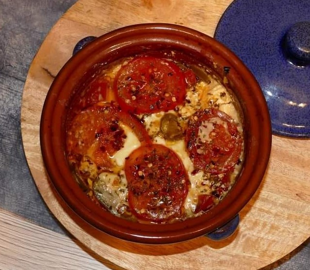 Προσθέστε άλλη μια κουταλιά της σούπας ελαιόλαδο και για άλλη μια φορά προσθέστε στρώσεις ντομάτα, φέτα, τσίλι και ρίγανη.