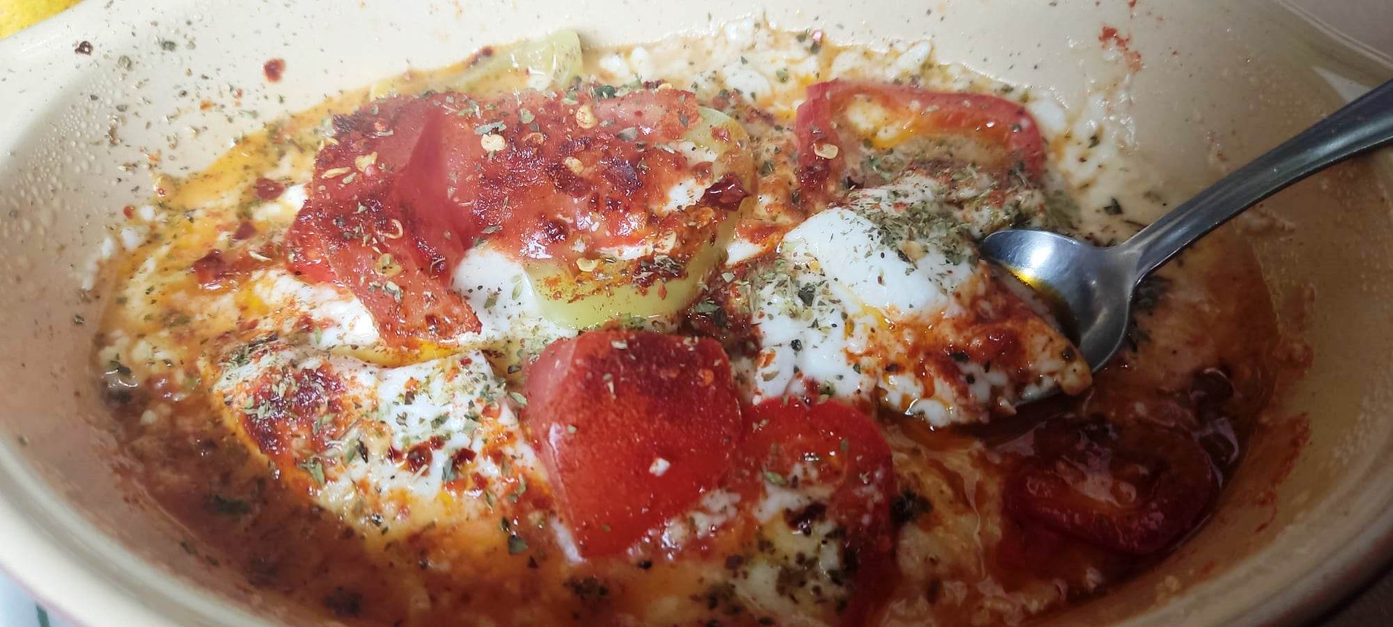 Ξεκινάμε και σε ένα πυρίμαχο σκεύος απλώνουμε τη βάση ψιλοκομμένη ντομάτα όχι όλο ίσα-ίσα που να καλύψουμε τη βάση