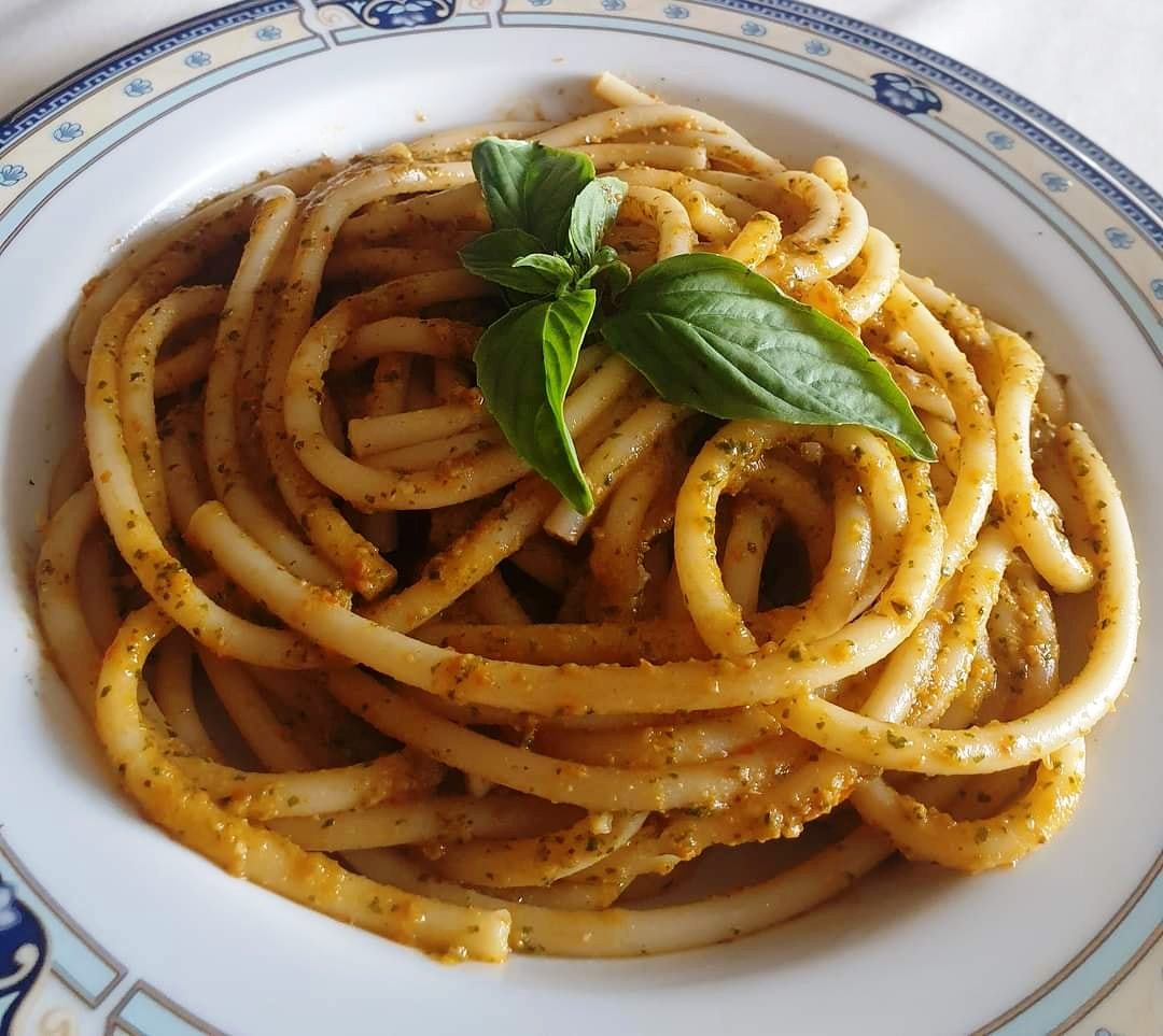 Στη συνέχεια, τοποθετήστε τα φύλλα σε ένα γουδί και αρχίστε να τα χτυπάτε δυνατά, σταδιακά και σιγά-σιγά συνδυάζοντας 50γρ αποξηραμένες ντομάτες καλά στραγγισμένες, 20γρ αλατισμένη κάπαρη ήδη αφαλατωμένη, μια αποφλοιωμένη και ψιλοκομμένη σκελίδα σκόρδο με ένα μαχαίρι, 50γρ καρύδια ., 10γρ κουκουνάρι, 40γρ τριμμένη παρμεζάνα, ρίξτε 40γρ παρθένο ελαιόλαδο, δουλεύοντας το πέστο μέχρι να έχετε ένα μάλλον κοκκώδες μείγμα.