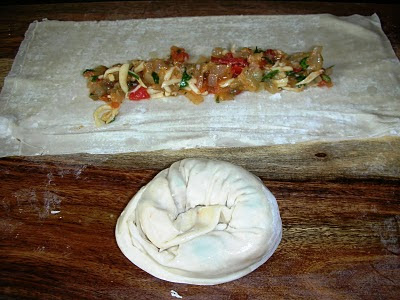 Τοποθετήστε 1 κουταλιά της σούπας από το μείγμα στην μεση και τυλίξτε σαν ένα πούρο. Στη συνέχεια, ξεκινώντας από το ένα άκρο, κυλήστε το πούρου που σχηματίσατε σε σχήμα τριαντάφυλλου σφραγίζοντας το άκρο με λίγο νερό. Βεβαιωθείτε ότι σφραγίζετε όλα τα ανοίγματα με λίγο νερό.