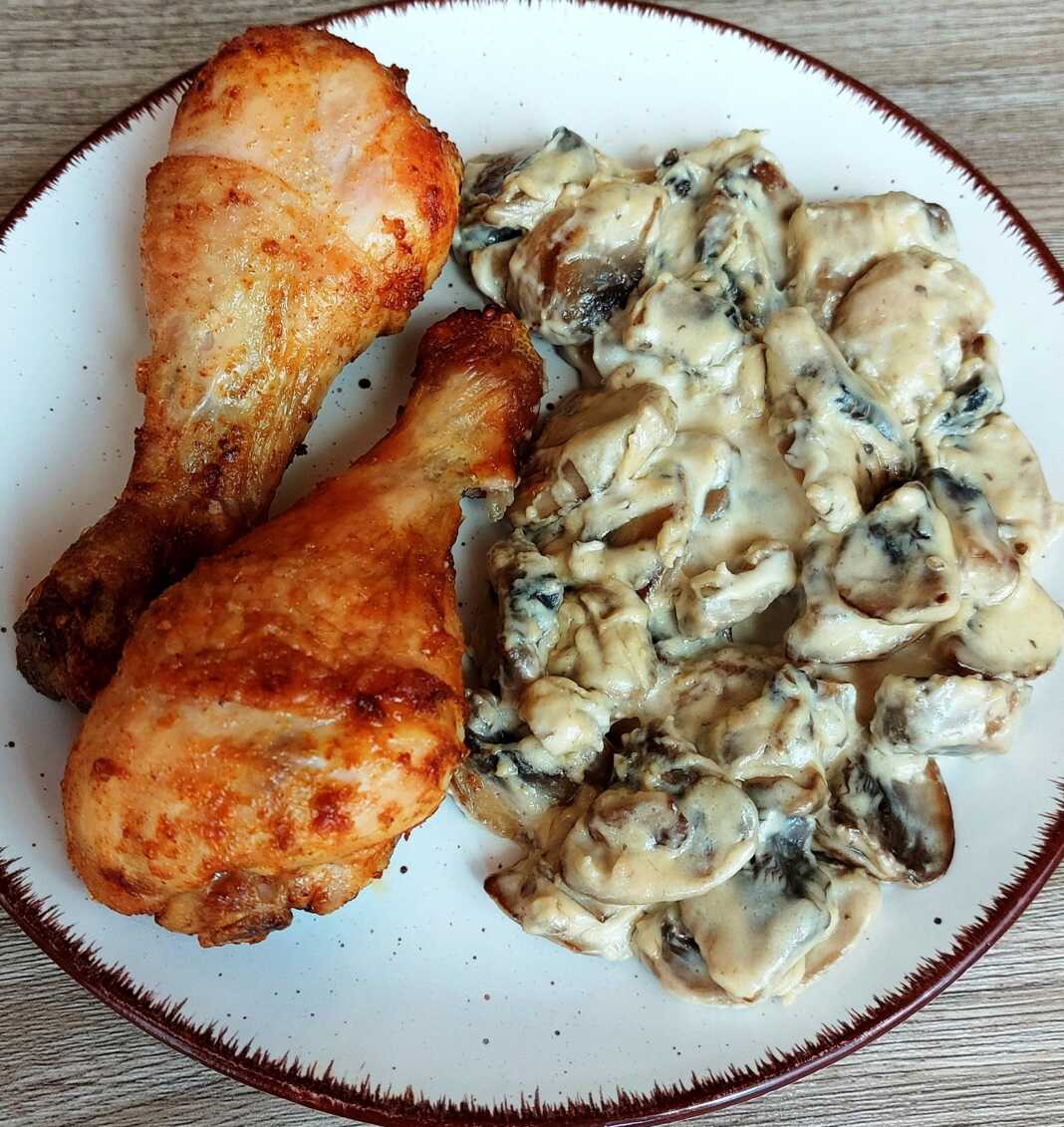 Μπουτάκια κοτόπουλου με μανιτάρια σε κρέμα σάλτσας.