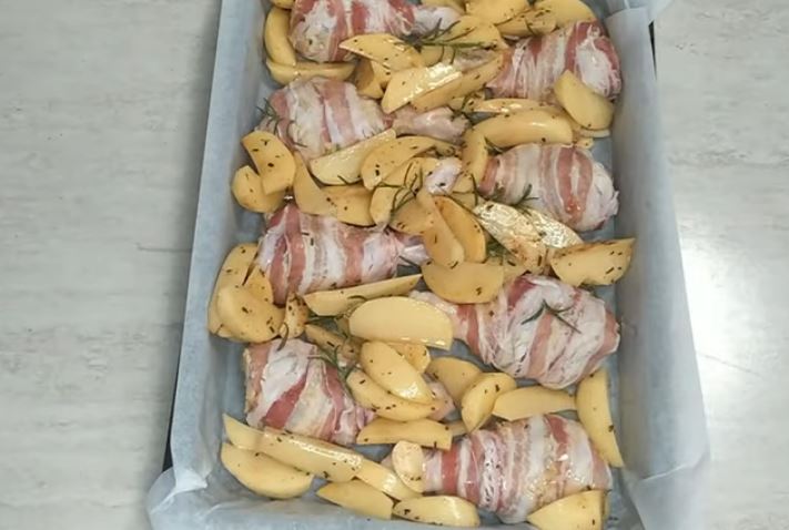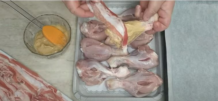 Στη συνέχεια αλείφουμε με ένα πινέλο με μουστάρδα τα μπούτια και μετά τα τυλίγουμε με μία φέτα μπέικον και τα τοποθετούμε σε ένα ταψί που έχουμε στρώσει με χαρτί ψησίματος.