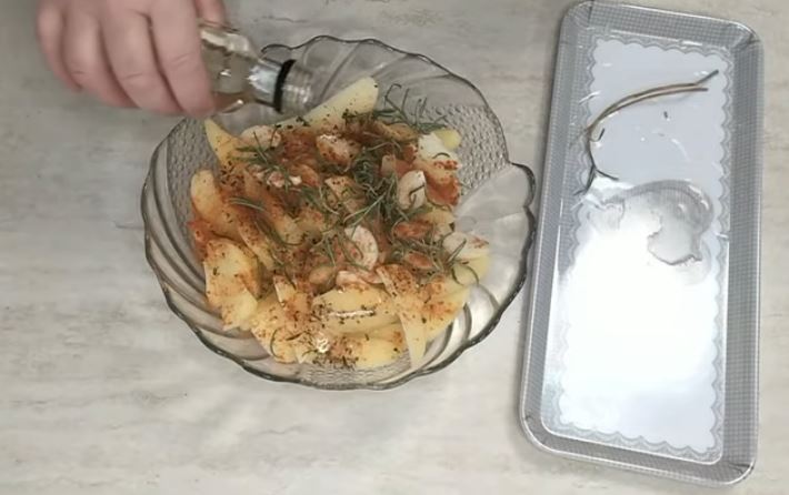 Τα βάζουμε στο ψυγείο για 30 λεπτά. Μετά σε ένα μπολ κόβουμε τις πατάτες κυδωνάτες στη συνέχεια ρίχνουμε το μείγμα βοτάνων, το σκόρδο σε φέτες επάνω στις πατάτες πάπρικα , δενδρολίβανο και το λάδι και ανακατεύουμε με τα χέρια.