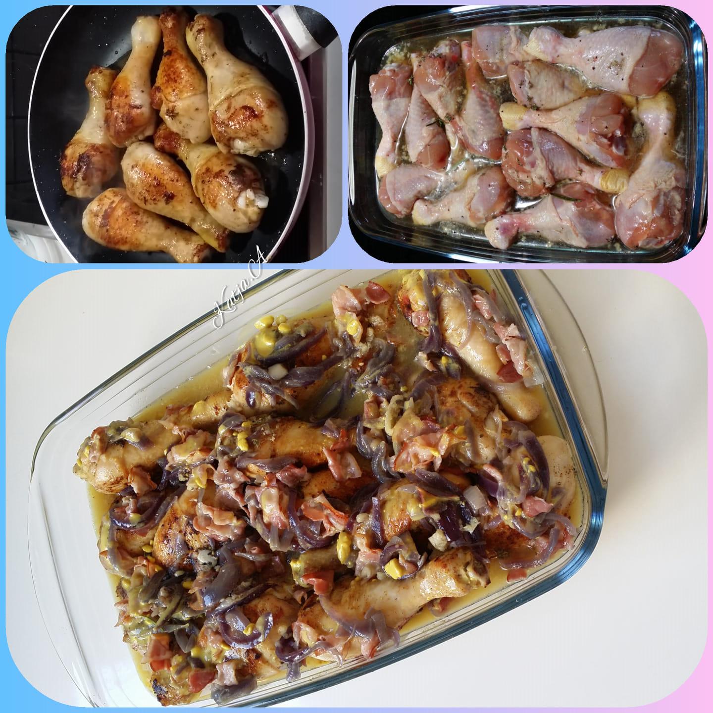 Σε ένα τηγάνι, βάζουμε λιγο λάδι και βούτυρο και τσιγαρίζουμε τα πόδια του κοτόπουλου, γυρίστε τα συχνά έτσι ώστε να είναι χρυσά και μεταφέρετέ τα σε ένα πυρεξ, μαζί με το κρεμμύδι με το μπεικον, προσθέστε τη μουστάρδα τα 3 / 4 από τη μαρινάδα, ανακατεύουμε καλά και την ρίχνουμε πάνω από το κοτόπουλο, ψήνουμε στους 200 ° για 40-50 λεπτά, γυρίζοντας μία φορά στο μισό του μαγειρέματος, σερβίρουμε με τη σάλτσα τους.