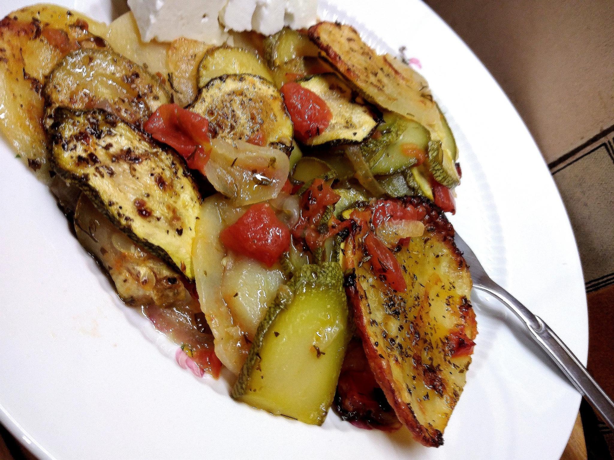 Γεμίζω το ταψί του φούρνου χωρίς να δημιουργώ πολύ παχιά στρώση, με πολύ λεπτές φέτες από πατάτες, κολοκύθια, ξερα κρεμμύδια