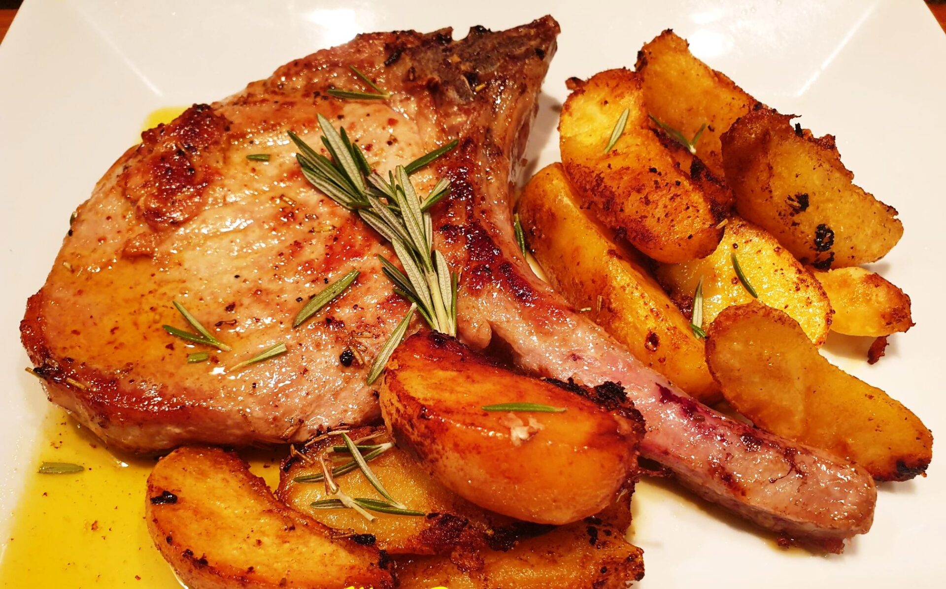 Μπριζόλα στο τηγάνι με πατάτες και δενδρολίβανο