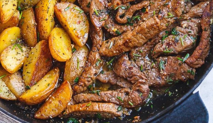 4. Ακριβώς πριν τελειώσετε με την μπριζόλα , μπορείτε να ανακατέψτε την μαρινάδα αν θέλετε και να μαγειρέψετε για ένα ακόμη λεπτό. Προσθέστε τις πατάτες σφήνες πίσω στο τηγάνι και μαγειρέψτε λίγο ακόμη. Βάλτε αλάτι και πιπέρι, αν είναι απαραίτητο.