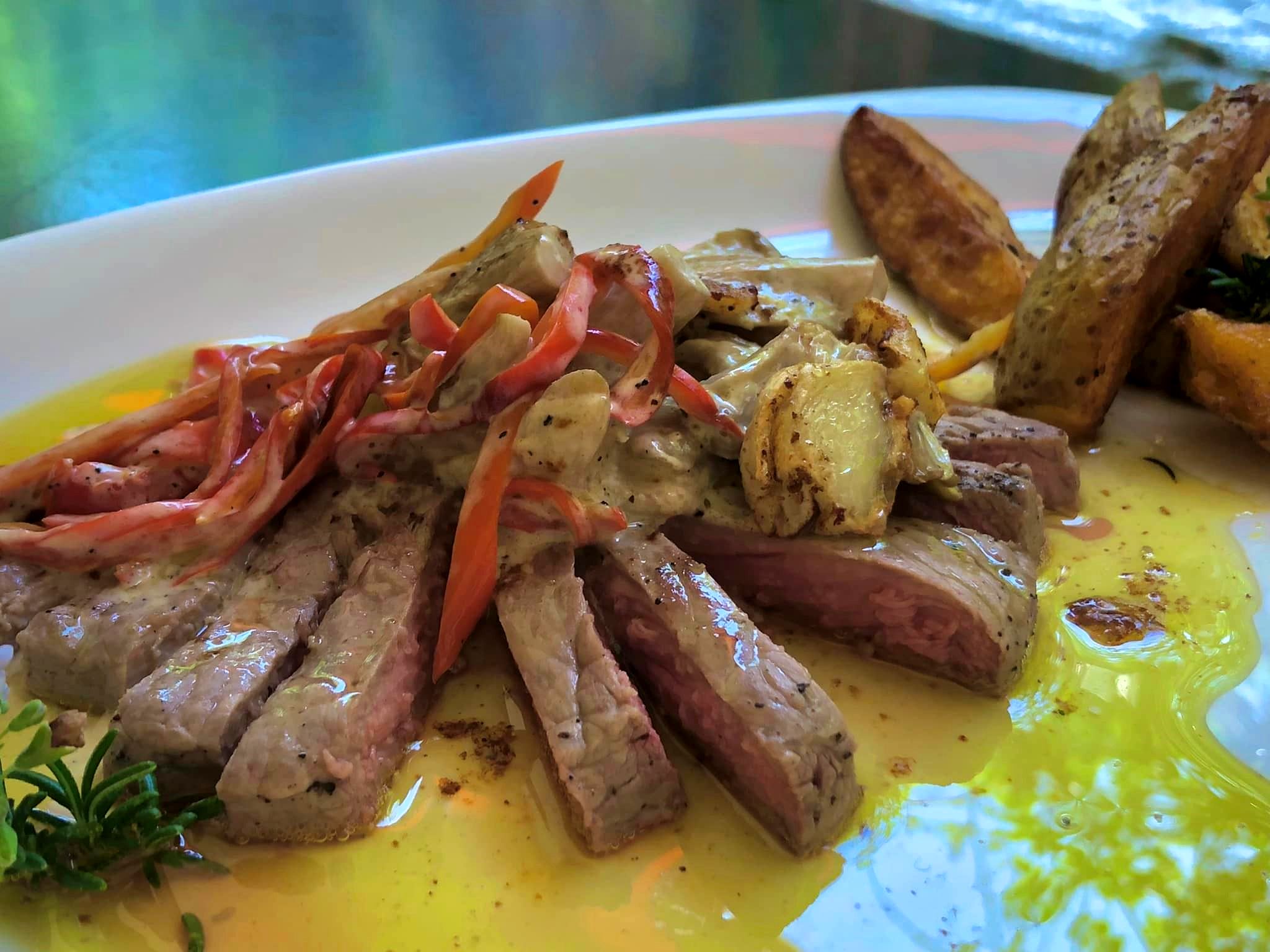 Μπριζόλα με μανιτάρια σοταρισμένα με κόκκινες πιπεριές και μαριναρισμένα σε λευκή κρεμώδη σάλτσα, σερβιρισμένα μαζί με πατάτες, τραγανές και μαλακες μαγειρεμένες σε λάδι και βούτυρο με σκόρδο και δεντρολίβανο.