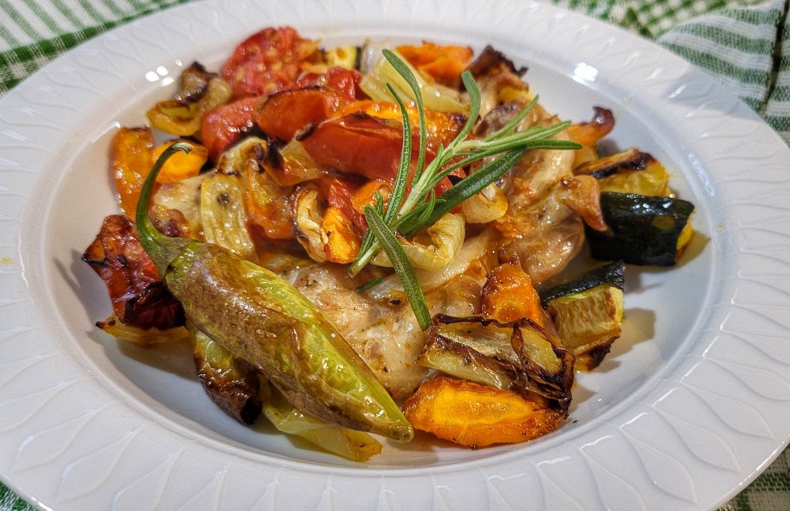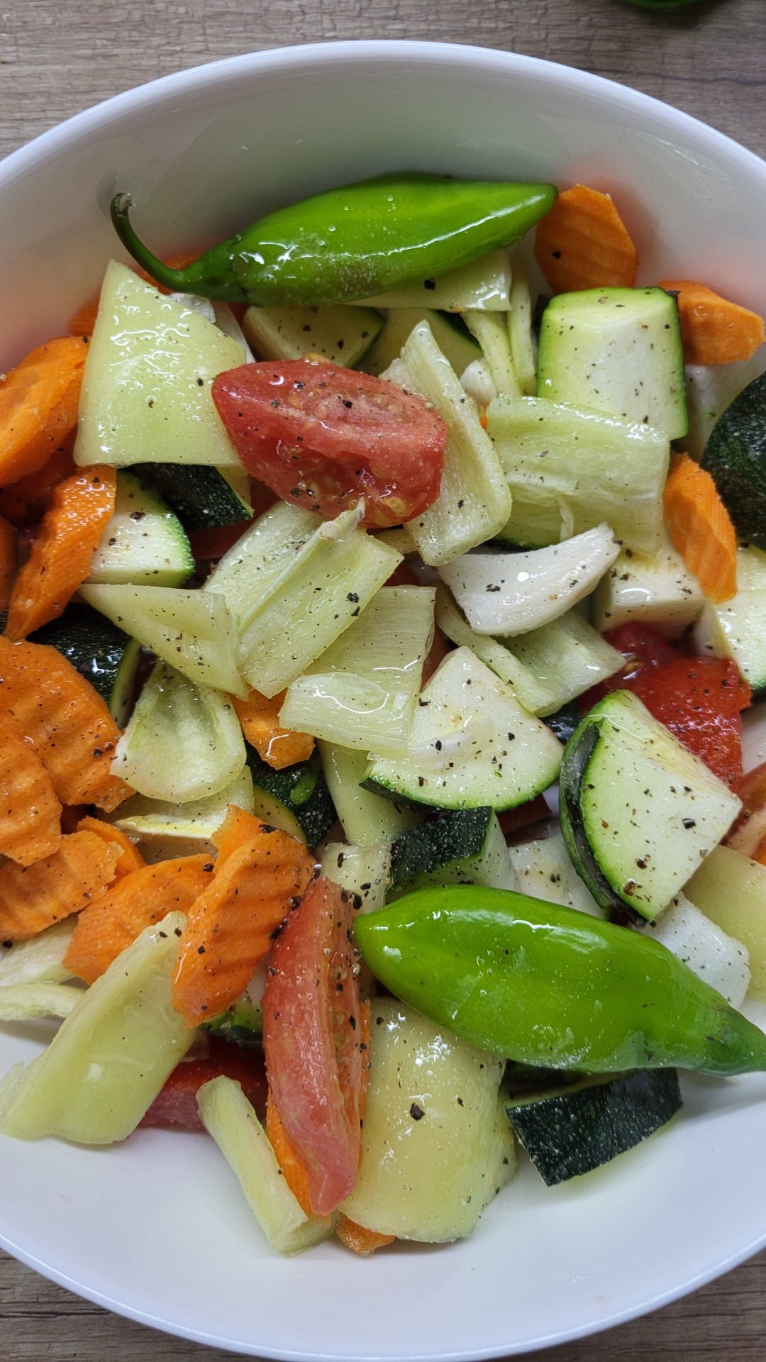 Τα λαχανικά είναι χοντροκομμένα, πασπαλίζουμε με αλάτι και πιπέρι, περιχύνουμε με λίγο ελαιόλαδο.