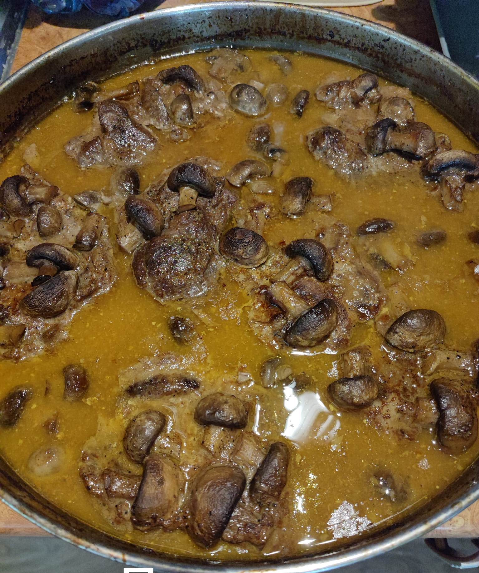 Το πρωί άλειψα ένα μεγάλο ταψί με λίγο λάδι,τακτοποίησα τις μπριζόλες,από πάνω τα μανιτάρια κομμένα στη μέση