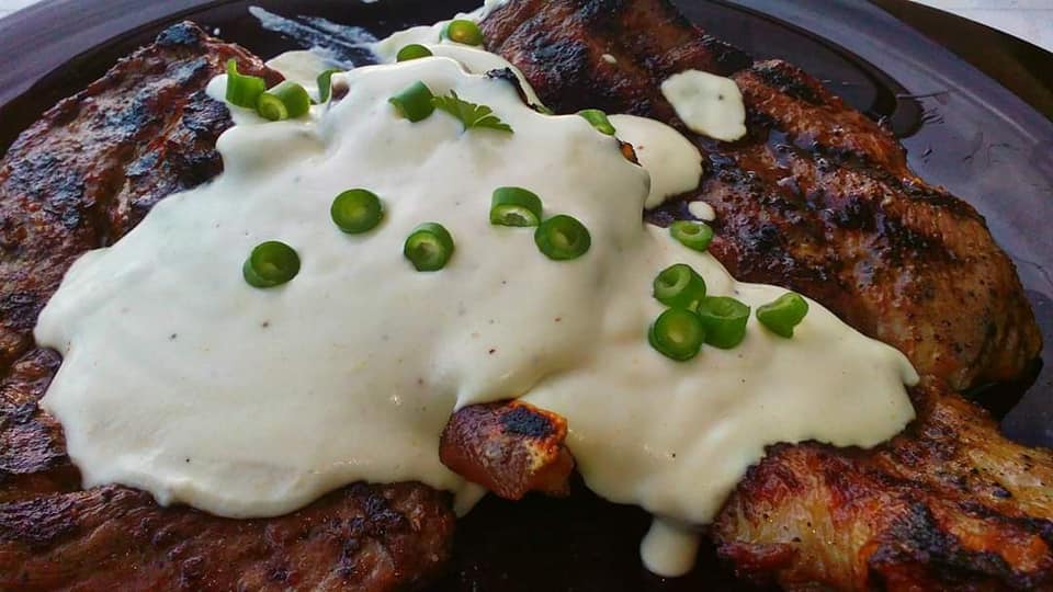 Σερβίρουμε τις μπριζόλες με σάλτσα γιαουρτιού πασπαλισμένο με φρέσκο κρεμμυδάκι ψιλοκομμένο