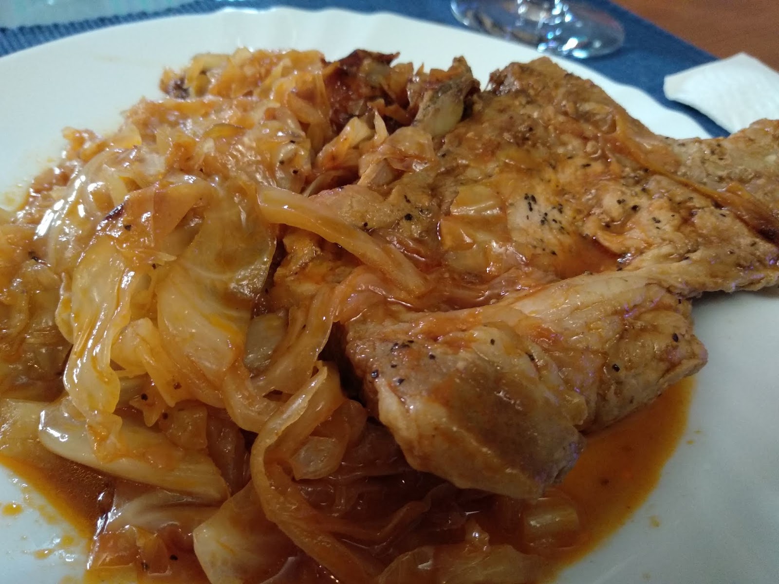 Κόβουμε το κρεμμύδι σε μικρά κομμάτια ανάλογα με την προτίμηση (μου αρέσει όχι πολύ), τις σκελίδες σκόρδο σε δύο ή τρία κομμάτια και το λάχανο σε λωρίδες.