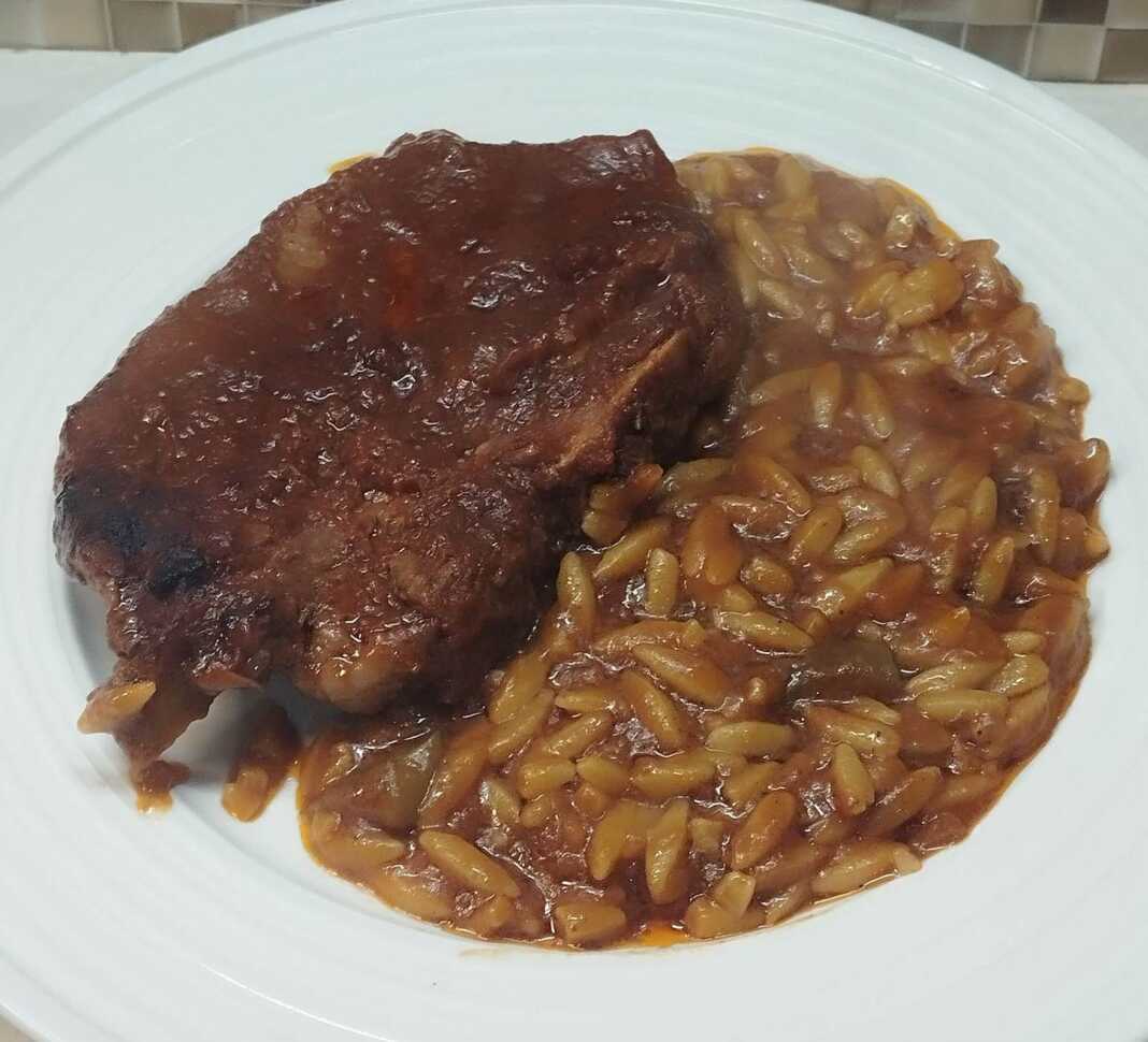Στη συνέχεια βγάζουμε τις μπριζόλες για να μη μας λιώσουν και ρίχνουμε το κριθαράκι και συμπληρώνουμε λίγο νερό αν χρειαστεί το βάζουμε να βράσει για 10-13′ λεπτά απο την ώρα που θα ξεκινήσει ο βρασμός.
