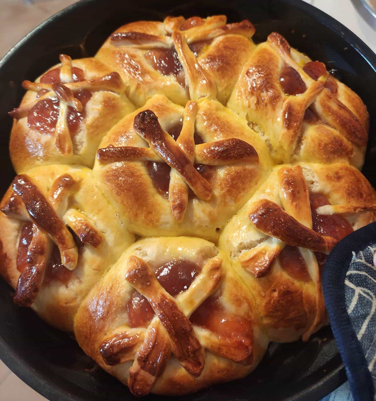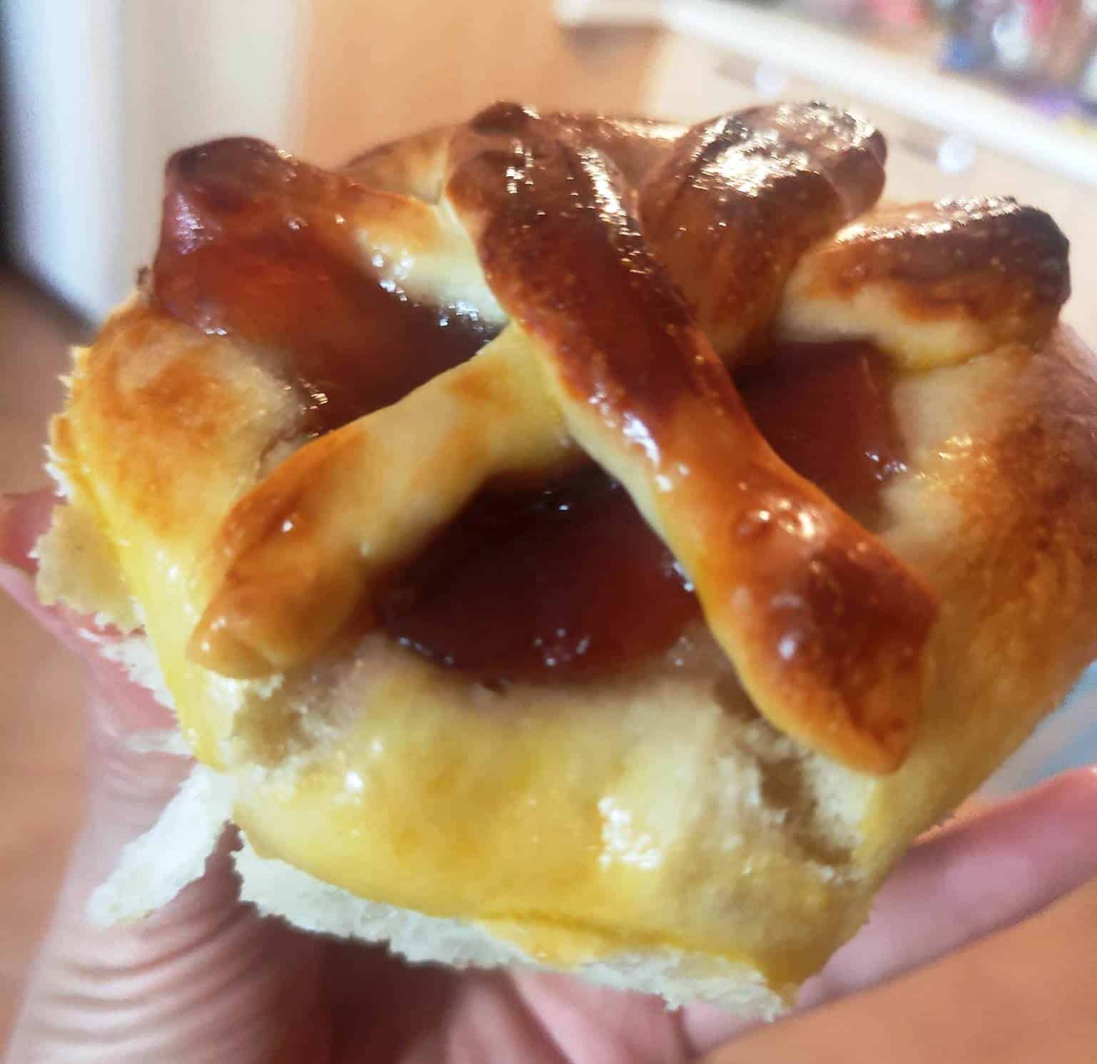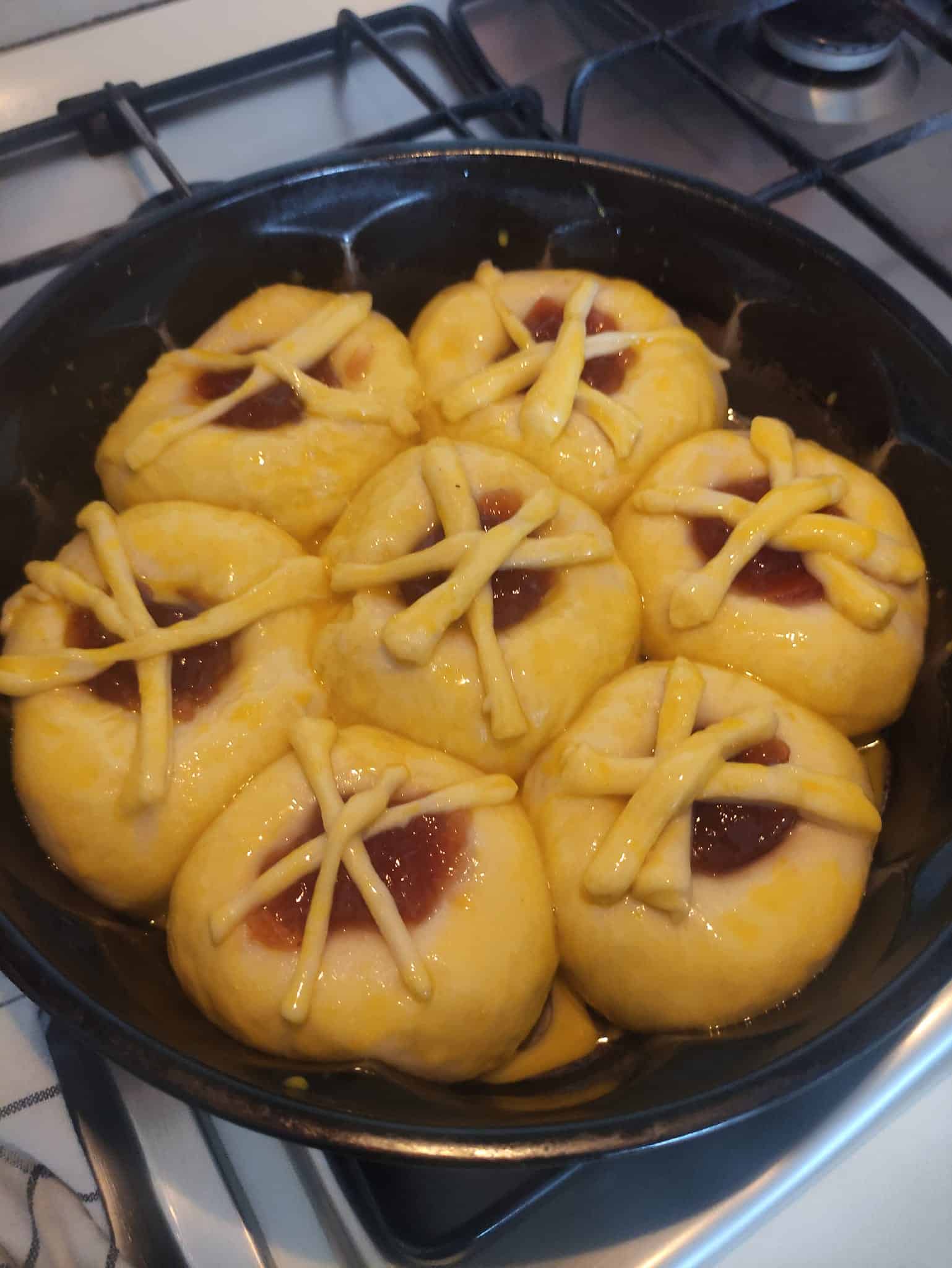 Τοποθετούμε τις μπάλες σε μια φόρμα και με πάτο ποτηριού, φτιάχνουμε φωλιές, βάζουμε από πάνω κουταλάκια του γλυκού μαρμελάδα, καλυπτουμε με τις λωρίδες και αφήνουμε να φουσκώσουν για δύο ώρες, αλείφουμε με αυγό και γάλα,