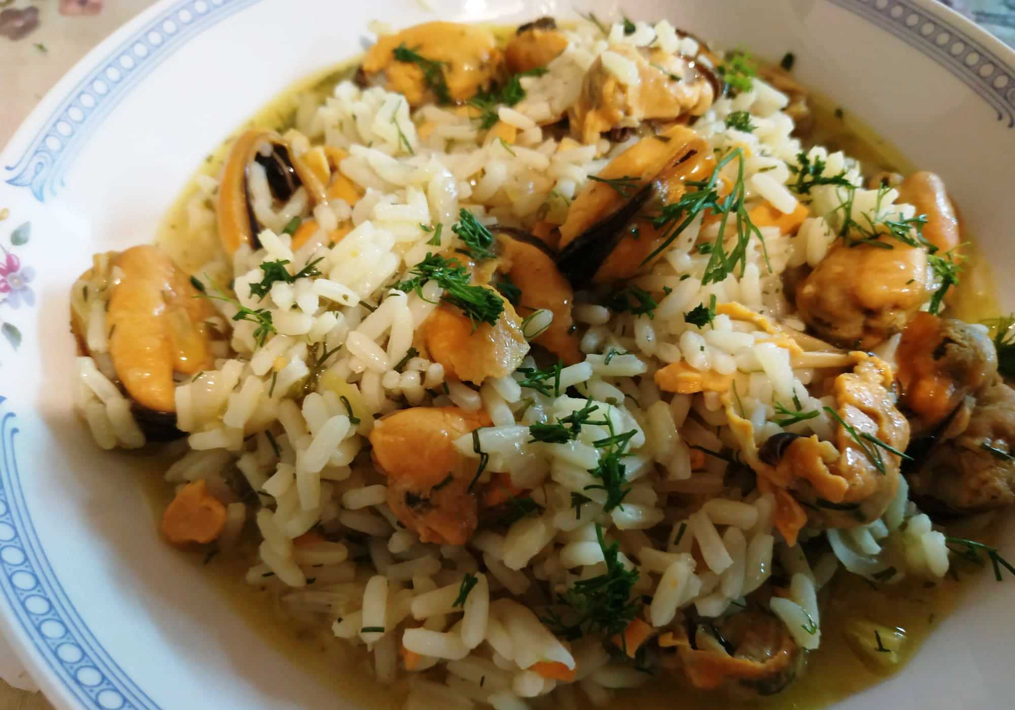 Όταν κοντεύει να γίνει, προσθέτουμε τα μύδια, λίγο άνηθο και ανακατεύουμε ελαφρά.