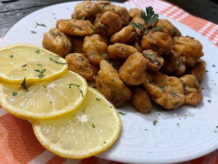 Περάστε τα μύδια στο χυλό που προκύπτει και τηγανίστε σε ένα ζεστό μείγμα βουτύρου και λαδιού.