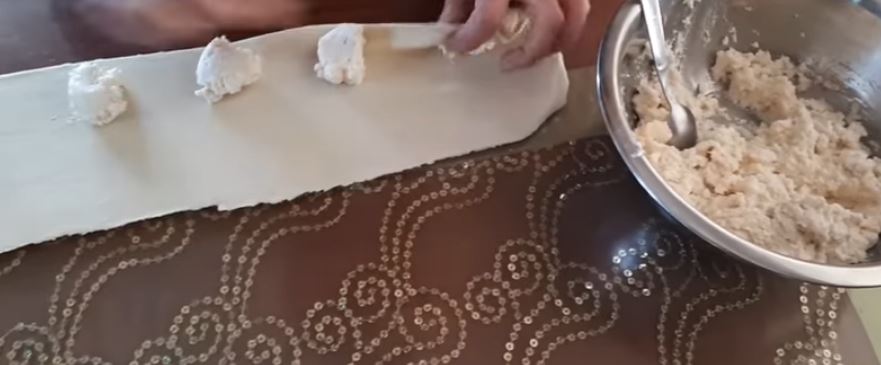 Παίρνουμε ένα μικρό κομμάτι ζυμάρι και το ανοίγουμε με τα χέρια μας. Βάζουμε μέσα ένα μπαλάκι μυζήθρα, το κλείνουμε και το πιέζουμε να γίνει πίτα.