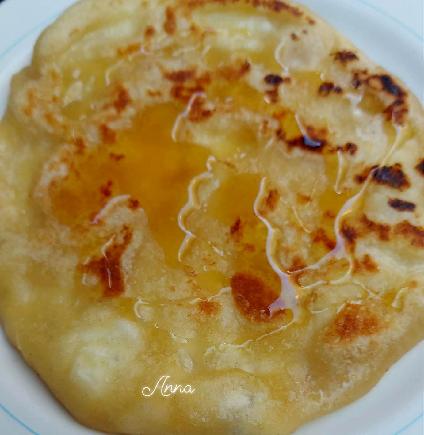 Βάζουμε την πίτα στο τηγάνι το οποίο έχει μόνο ένα φιλμ λαδιού. Την πατάμε με βρεγμένα χέρια μέχρι να γίνει λεπτή και την ψήνουμε από τις δύο μεριές.