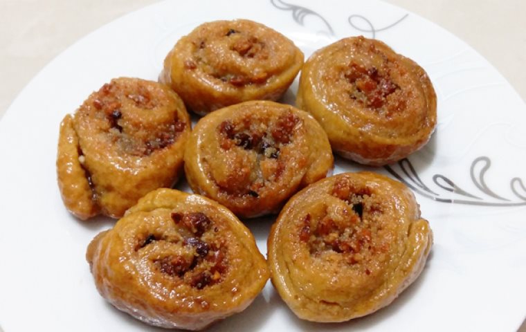 Ανοίγουμε μέρος από την ζύμη μας σε φύλλο. Βάζουμε γέμιση από την μια άκρη ως την άλλη άκρη ,κλείνουμε τις άκρες και τυλίγουμε σε ρολό. Το τοποθετούμε σε ταψί που στρώσαμε λαδόκολλα και το χαράζουμε σε μέτρια κομμάτια. Ακολουθούμε την ίδια διαδικασία μέχρι να τελειώσουν τα υλικά μας.