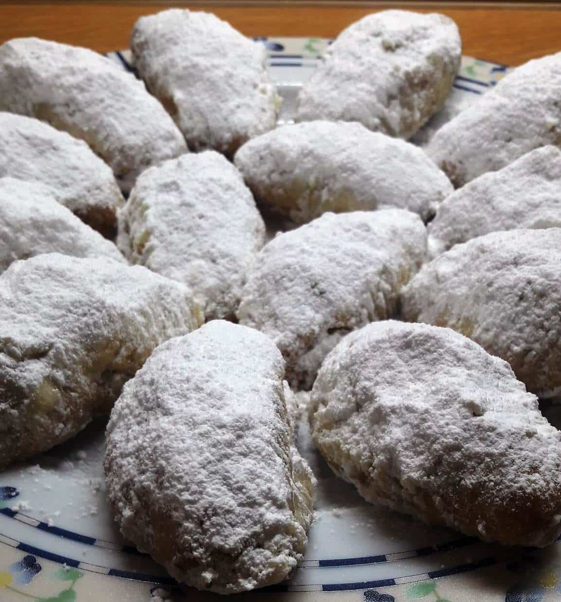 Αφήνουμε τα σαλιάρια να κρυώσουν ελαφρώς τα ψεκάζουμε με ανθόνερο και τα τυλίγουμε με την άχνη πριν τα σερβίρουμε.