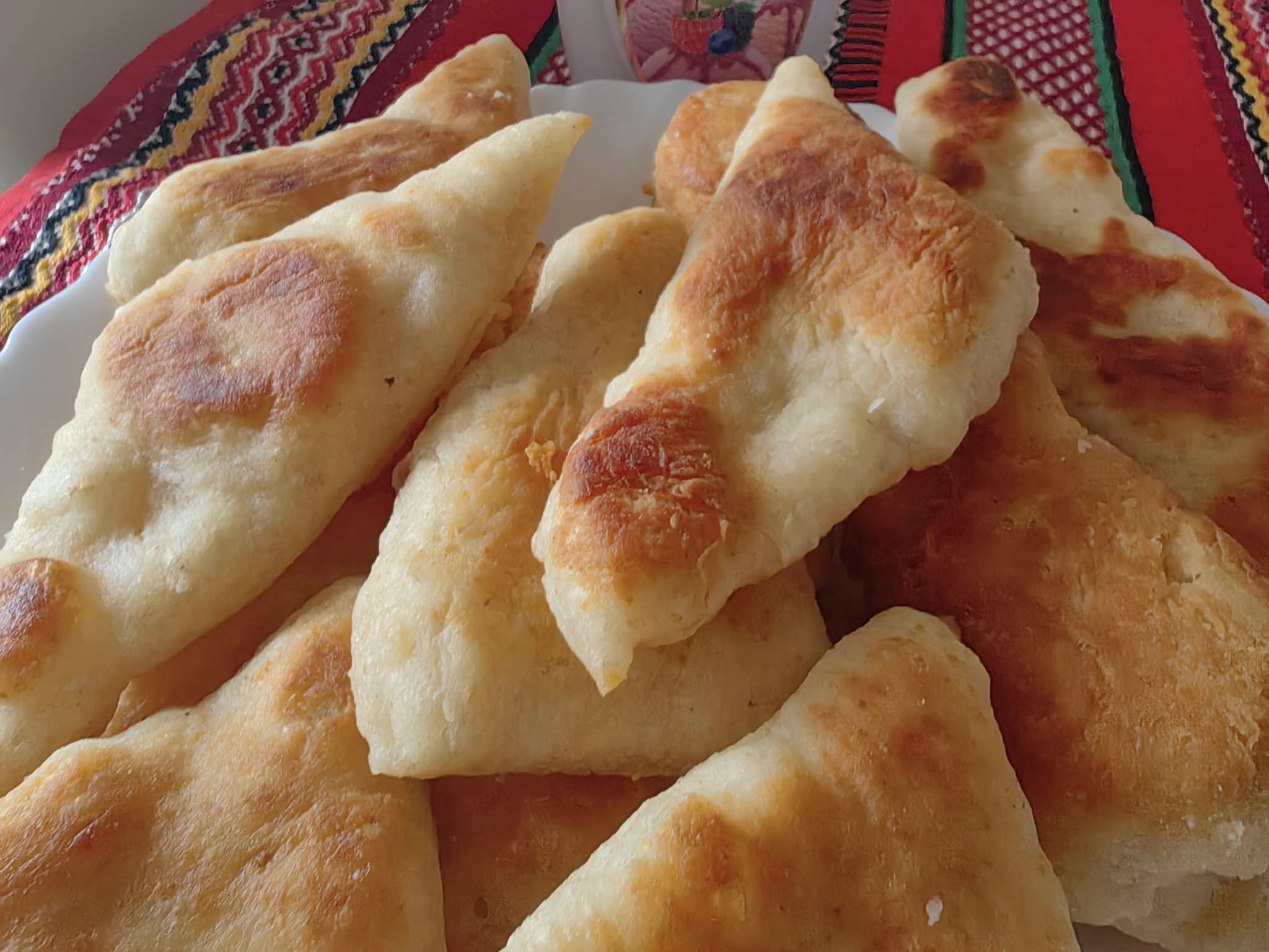 Τηγανίζω τα τρίγωνα σε καυτό λάδι, μέχρι να ροδίσουν και από τις δύο πλευρές.