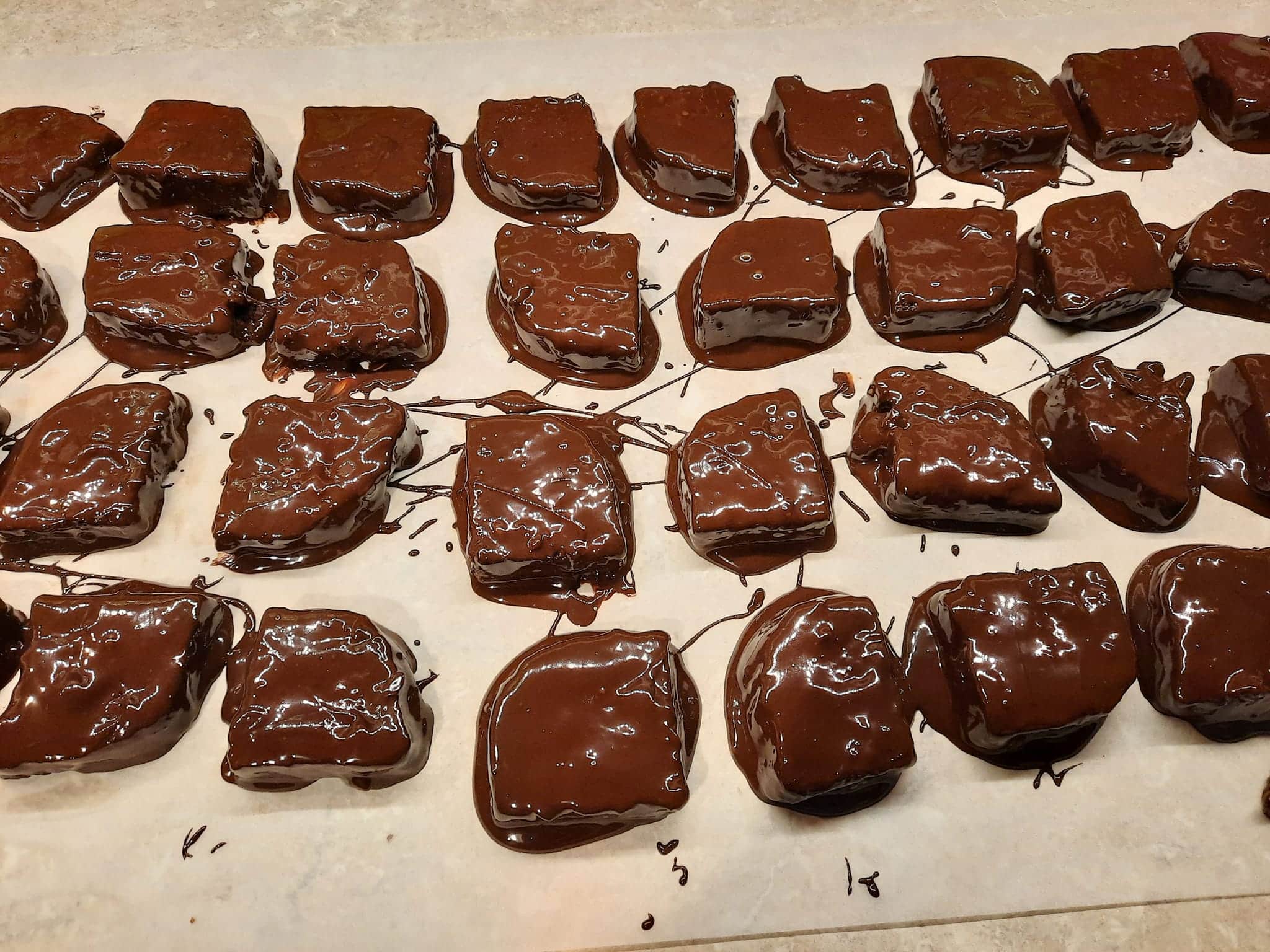 Λιώνουμε την κουβερτούρα σε μπεν μαρί και βουτάμε μία-μία της καριόκες της βάζουμε σε λαδόκολλα να στεγνώσουν καλά