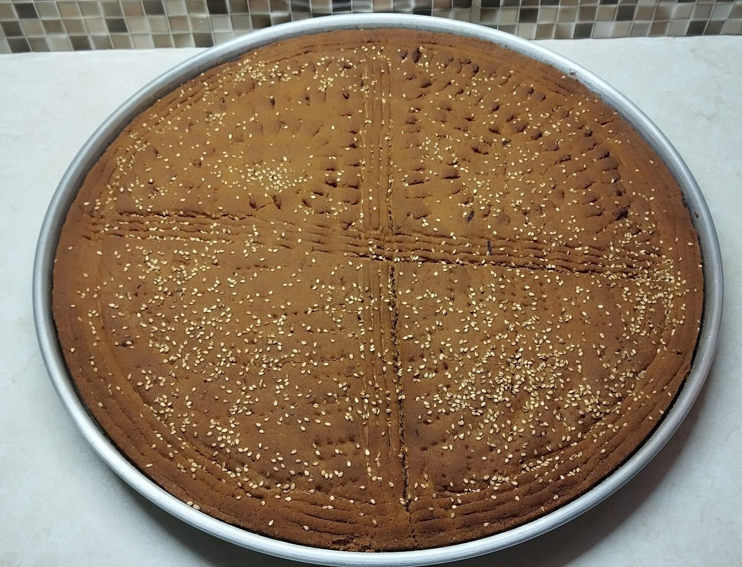 γύρω-γύρω με ένα πιρούνι , ρίχνουμε λίγο σουσάμι,την ψήνουμε στους 180 με 200 βαθμούς για 40 -45λεπτά