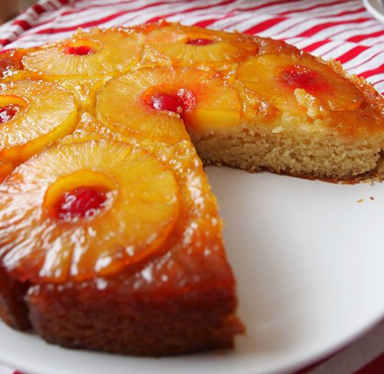 Περιχύνουμε τις ροδέλες με το μείγμα και ψήνουμε για 35 με 45 λεπτά ελέγχοντας με μια οδοντογλυφίδα. Μόλις το βγάλουμε από τον φούρνο περνάμε αμέσως ένα μαχαίρι γύρω από τα τοιχώματα. Τοποθετούμε ένα πιάτο πάνω στη φόρμα και αναποδογυρίζουμε το κέικ όσο είναι ακόμα ζεστό. Αν κάποιος ανανάς μείνει κολλημένος στο ταψί τον ξεκολλάμε προσεκτικά και τον βάζουμε πίσω στη θέση του.