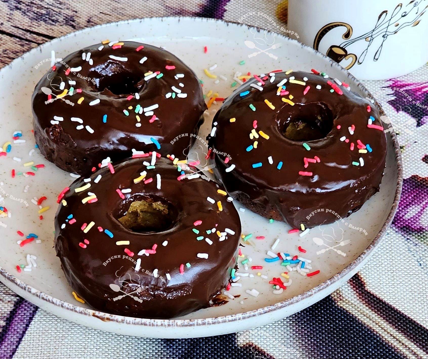 Ανακατέψτε σε χαμηλή φωτιά μέχρι να σχηματιστεί ένα λείο μείγμα σοκολάτας. Στη συνέχεια, βουτάω τα ντόνατς στη ζεστή ακόμα γκανάς και τα βάζω στο ψυγείο.
