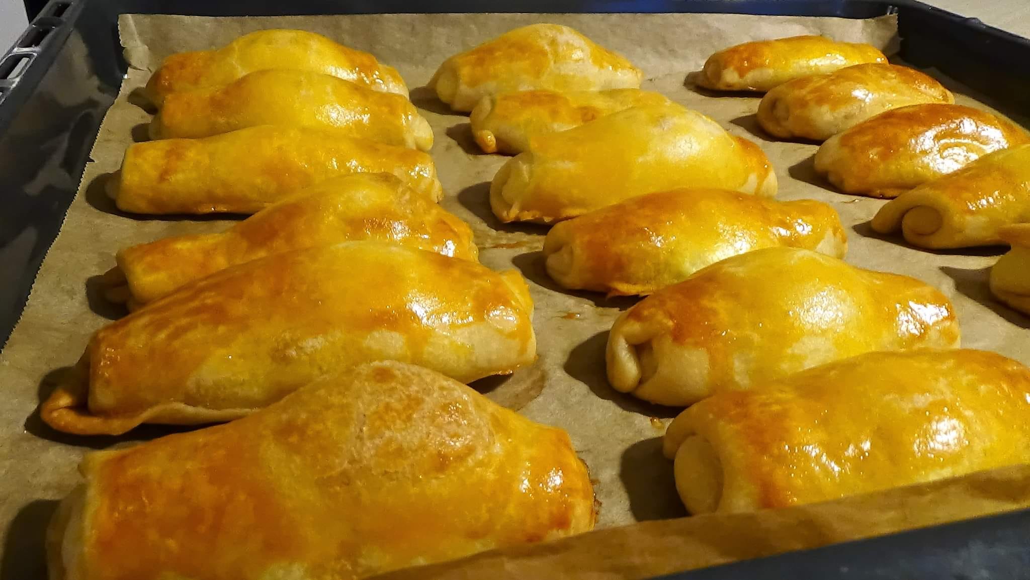 Αραδιάζουμε τα έτοιμα σνακ σε ταψί με χαρτί ψησίματος.