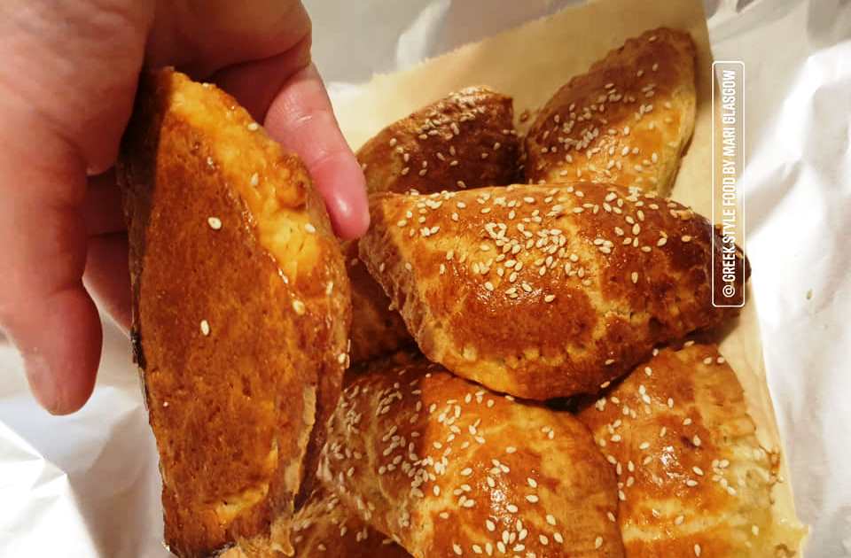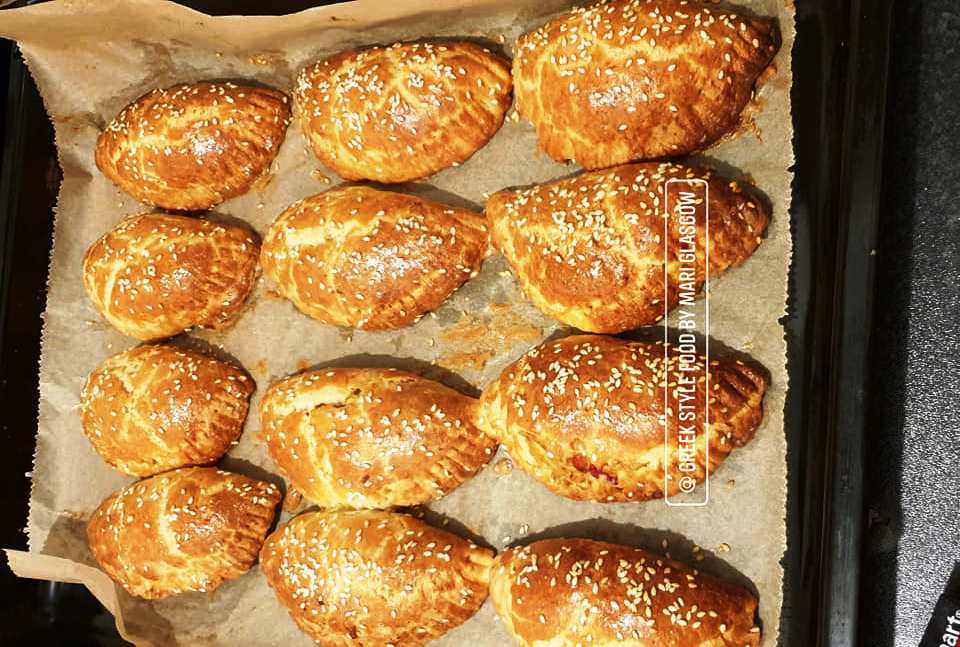 Διπλώστε απαλά και κλείστε με ένα πιρούνι. Κάντε το ίδιο έως ότου τελειώσετε όλη τη ζύμη. Τοποθετήστε τις πίτες στο ταψί στρωμένο με χαρτί ψησίματος. Βουρτσίστε με αυγό στην κορυφή και χρησιμοποιήστε σουσάμι αν θέλετε.