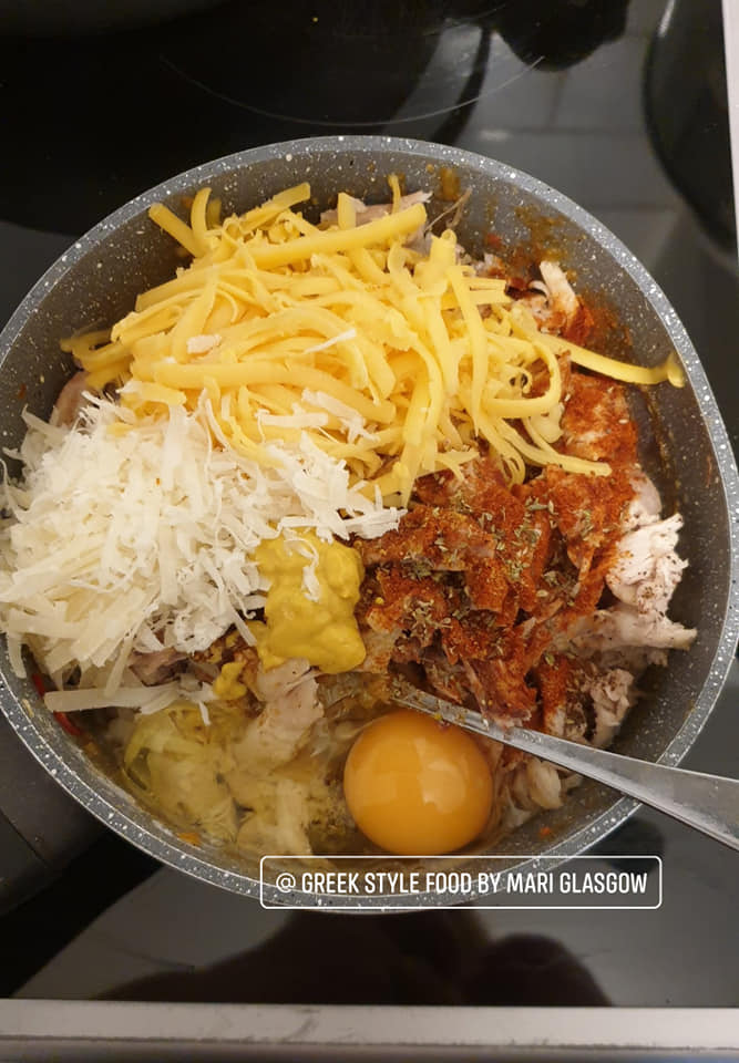4-Αφαιρέστε από τη φωτιά και προσθέστε το κοτόπουλο, το αυγό, το τυρί γραβιέρα, το μαϊντανό ψιλοκομμένο, πιπέρι, πάπρικα, μουστάρδα, κάρυ αλάτι και ανακατέψτε καλά.