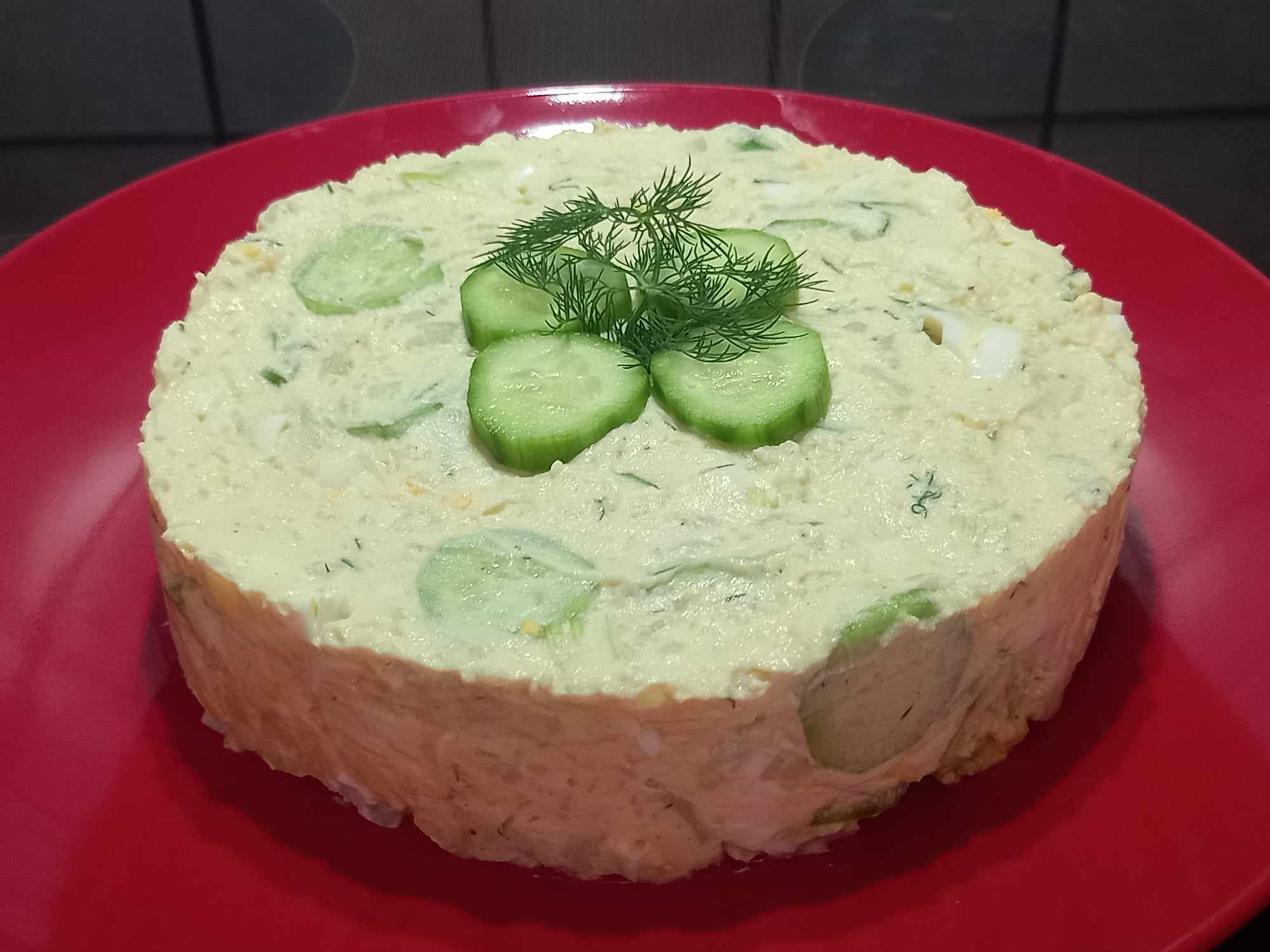 Καθαρίζουμε τ αυγά και τα κόβουμε κυβάκια.Στραγγίζουμε τ αγγουράκια.Ψιλοκόβουμε τον άνηθο και τα κρεμμυδάκια.Καθαρίζουμε τις πατάτες αφού κρυώσουν και τις κόβουμε και αυτές κυβάκια.