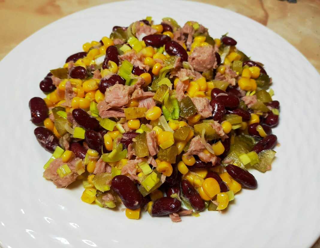 Στύβουμε τις κονσέρβες, προσθέτουμε τις ψιλοκομμένες πίκλες και τα πράσα, αλατοπιπερώνουμε και λίγο ελαιόλαδο, ανακατεύουμε καλά και έχουμε μια υπέροχη σαλάτα που μπορεί εύκολα να αντικαταστήσει το κυρίως πιάτο!