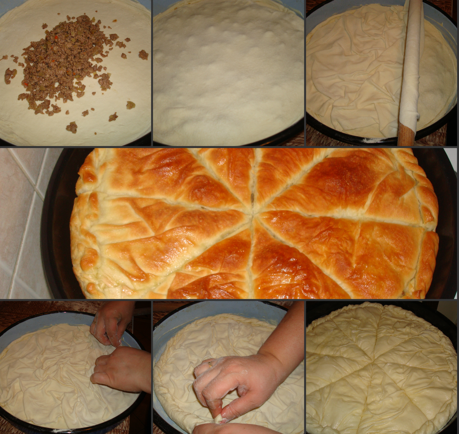 Λιπαίνουμε το ταψί με μαργαρίνη, τοποθετείτε το πρώτο φύλλο, τοποθετείτε τη γέμιση, το δεύτερο φύλλο και το τελευταίο φύλλο από πάνω, αλείφετε με λίγο λάδι και αφήνετε στην άκρη για περίπου 15 λεπτά καλυμμένη με μία πετσέτα.