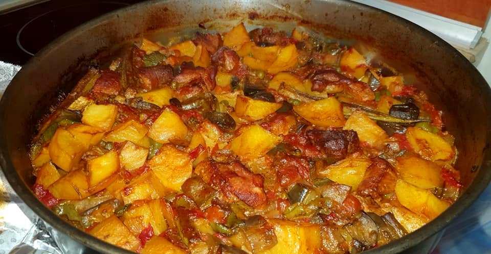 Στη συνέχεια προσθέτουμε τη μελιτζάνα, τον αρακά και τις μπάμιες και μετά από ένα-δύο λεπτά ρίχνουμε στο ταψι.