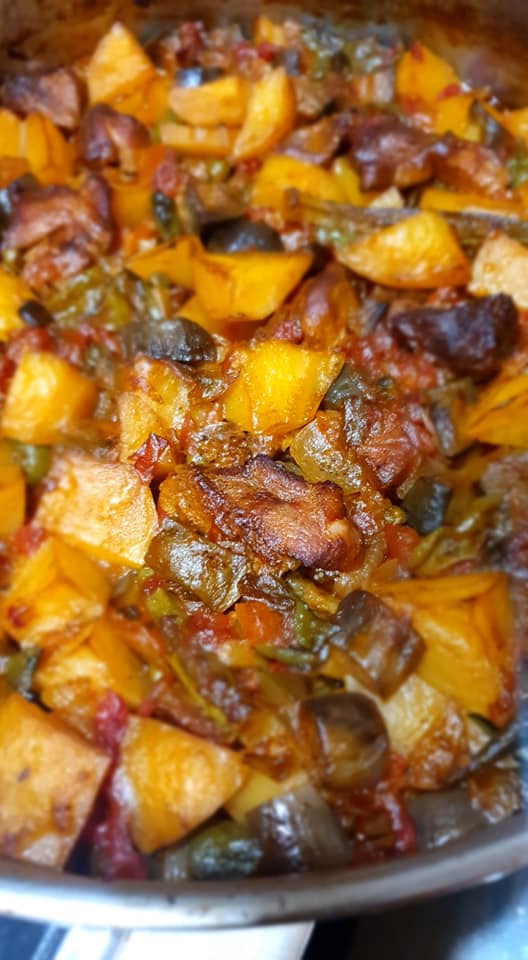 με το ίδιο λάδι τσιγαρίζουμε το κρεμμύδι, την πιπεριά και τις ντομάτες που είναι ψιλοκομμένα.