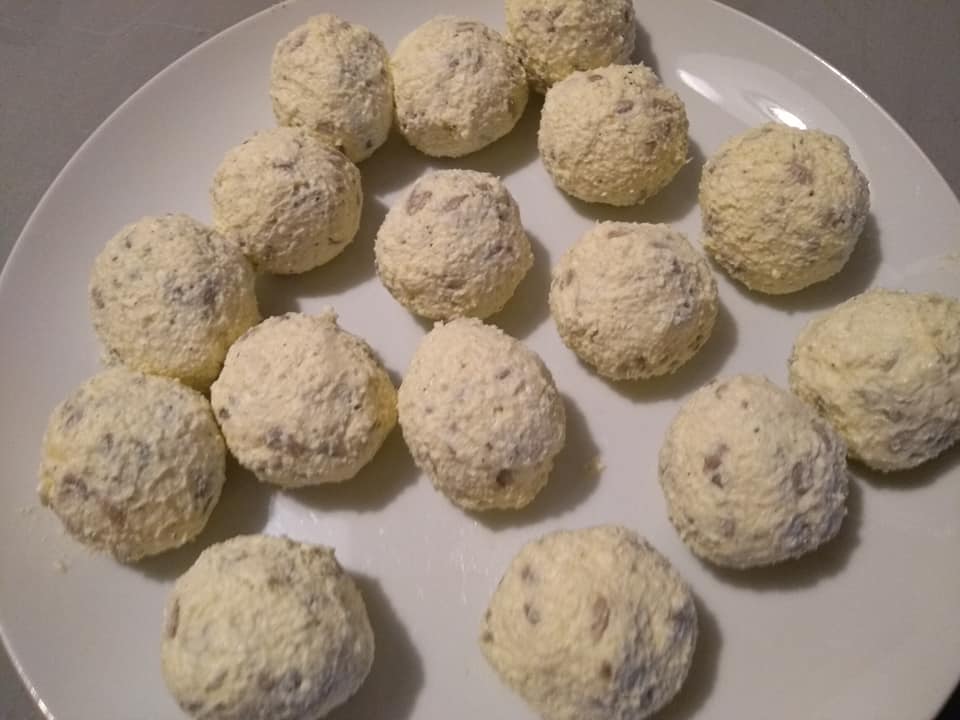 Το τυρί πολτοποιείται με ένα πιρούνι σε μικρά ψίχουλα. Ανακατεύουμε με ηλιόσπορο, μαύρο πιπέρι, τριμμένο σκόρδο και μαϊντανό. Σχηματίζονται μικρά μπαλάκια σε μέγεθος καρυδιού. Τα βουτάμε στο αυγό, τα τυλίγουμε σε τριμμένη φρυγανιά, μετά τα βουτάμε πάλι στο αυγό