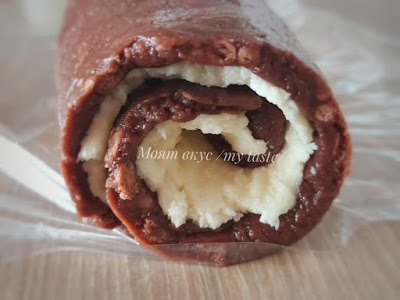 Τα μπισκότα τα τρίβουμε σε μικρά κομμάτια και αναμιγνύονται με κακάο. Σε 100 ml ζεστό νερό διαλύστε τη ζάχαρη και περιμένετε να κρυώσει. Ρίχνουμε τα μπισκότα και ανακατεύουμε καλά, μέχρι να έχει μια συνοχή ζύμης.