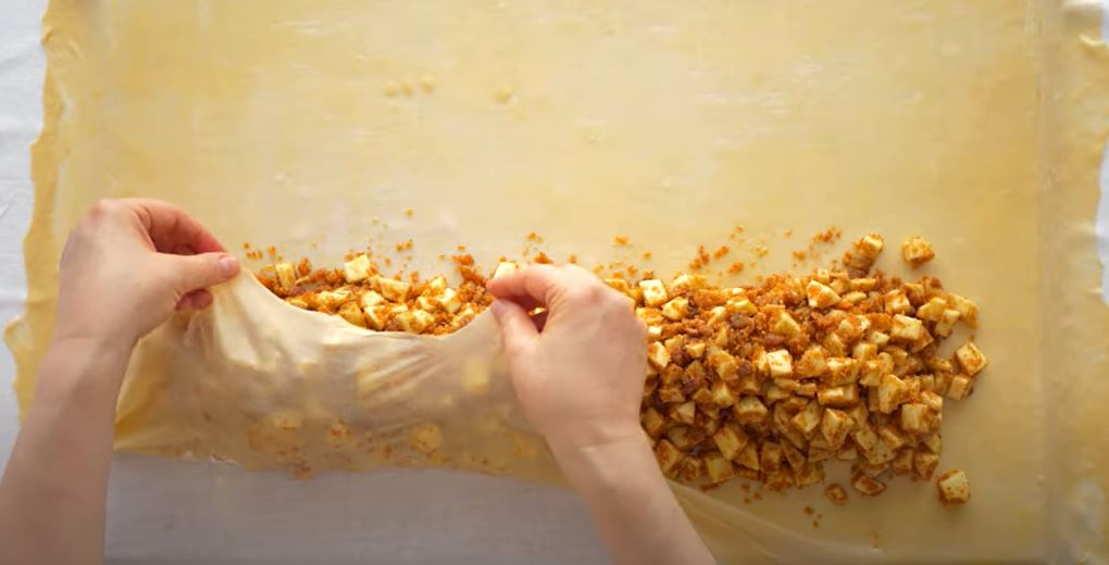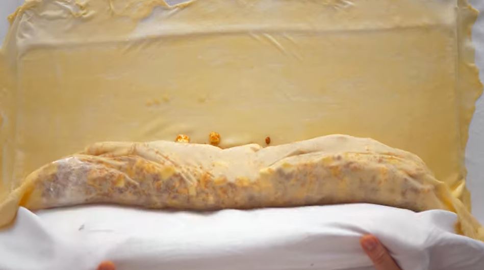 Χωρίζουμε τη γέμιση σε δύο μέρη. Απλώνουμε το ένα μέρος ομοιόμορφα στην φαρδια άκρη της ζύμης. Στη συνέχεια τυλίγουμε τη ζύμη με τη γέμιση σε ρολό.