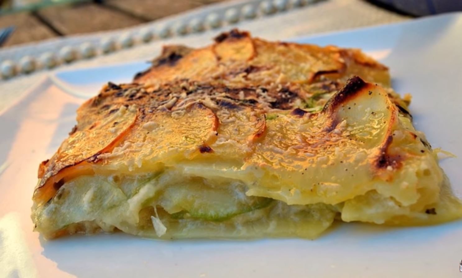 Ξεφλουδίζουμε τις πατάτες και τα κολοκυθάκια όχι πλήρως. Τα κόβουμε σε λεπτές φέτες με το εργαλείο κοπής.