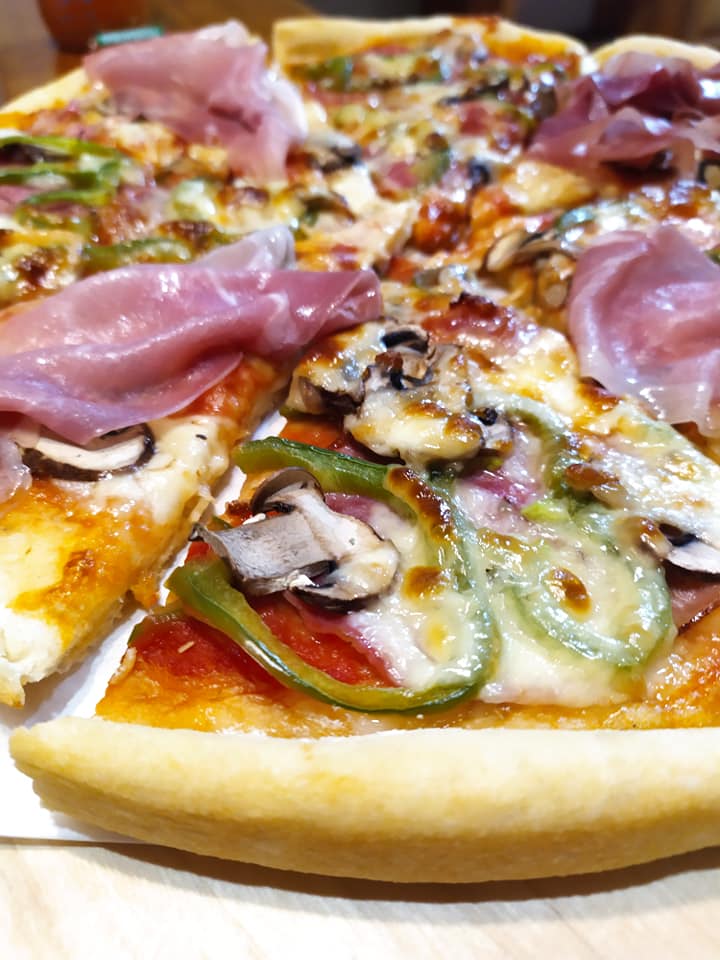 Επέλεξα μοτσαρέλα, πράσινες πιπεριές, μανιτάρια, προσούτο και λουκάνικο.