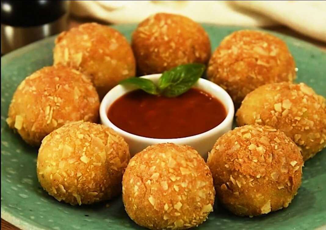 – Περάστε τις μπάλες ρυζιού μέσα από αλεύρι, μετά από αυγά και έπειτα από την φρυγανιά.