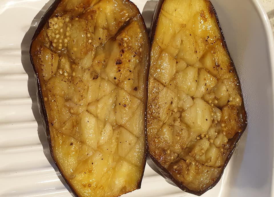 Πλένουμε τις μελιτζάνες, κόβουμε την κορυφή, κόβουμε στη μέση κατά μήκος. Χαράξτε τις με ένα μαχαίρι εσωτερικά. Προσθέστε αλάτι και πιπέρι και ελαιόλαδο. Στη συνέχεια, σε ένα ταψί βάλτε χαρτί ψησίματος και τις βάζετε προς τα κάτω, με το εξωτερικό στραμμένο προς τα πάνω. Ψήνουμε στους 200 για περίπου 40 λεπτά. Ελέγξτε αν είναι ωραίες και απαλές.