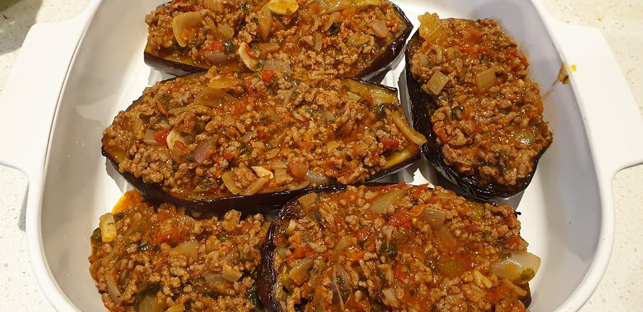 Οταν οι μελιτζάνες και το μείγμα του κιμά μαγειρευτούν, βάλτε το μείγμα πάνω στις μελιτζάνες,