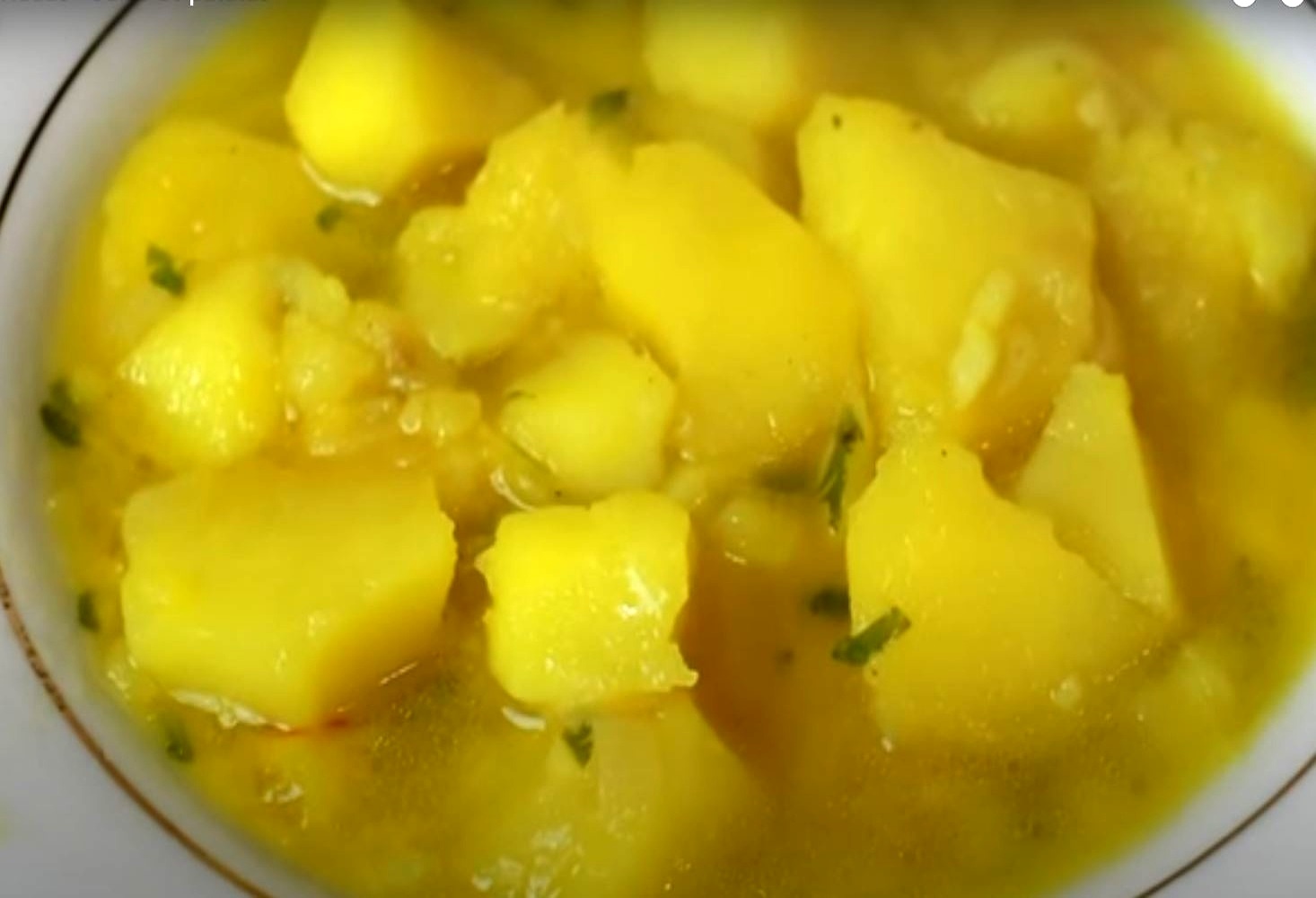 Μαγειρέψτε μέχρι να μαλακώσει το κρεμμύδι και πριν ροδίσει. Προσθέστε τις πατάτες, τον φρέσκο μαϊντανό κομμένο σε μικρά κομμάτια, λίγο αλεσμένο μαύρο πιπέρι, μερικές ίνες σαφράν και σκεπάστε τις πατάτες με νερό. Καλύψτε την κατσαρόλα και μαγειρέψτε σε χαμηλή μέτρια φωτιά για περίπου 20 λεπτά.