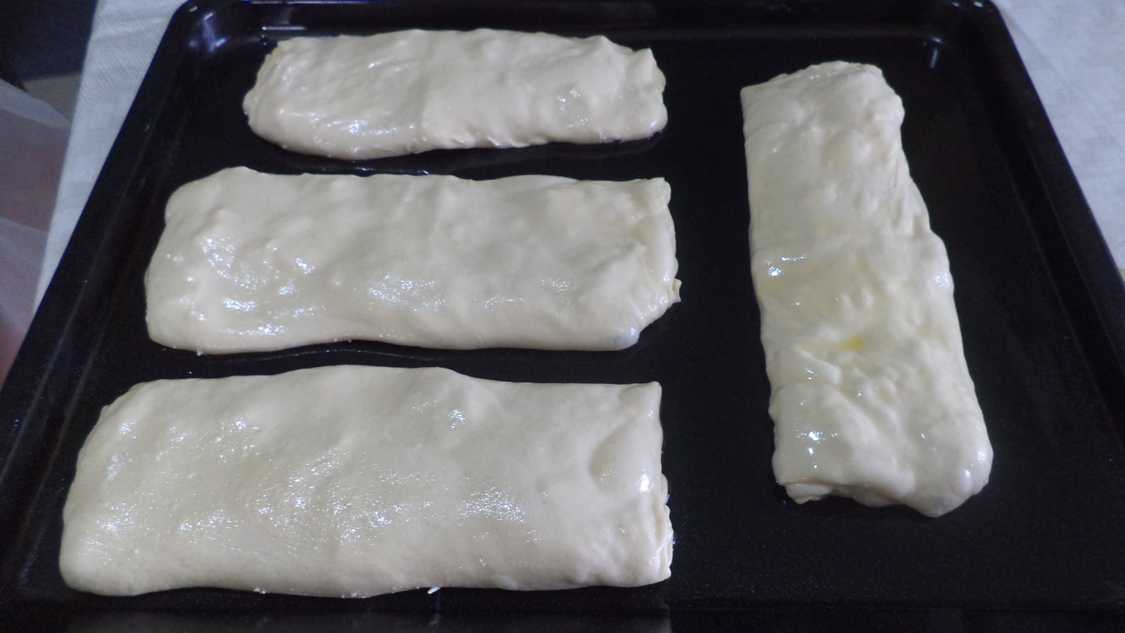 Τη μοίρασα σε 4 μπαλάκια, ισιωσα το καθένα σε μια μικρή κρούστα, αλείψα με λάδι και βούτυρο.