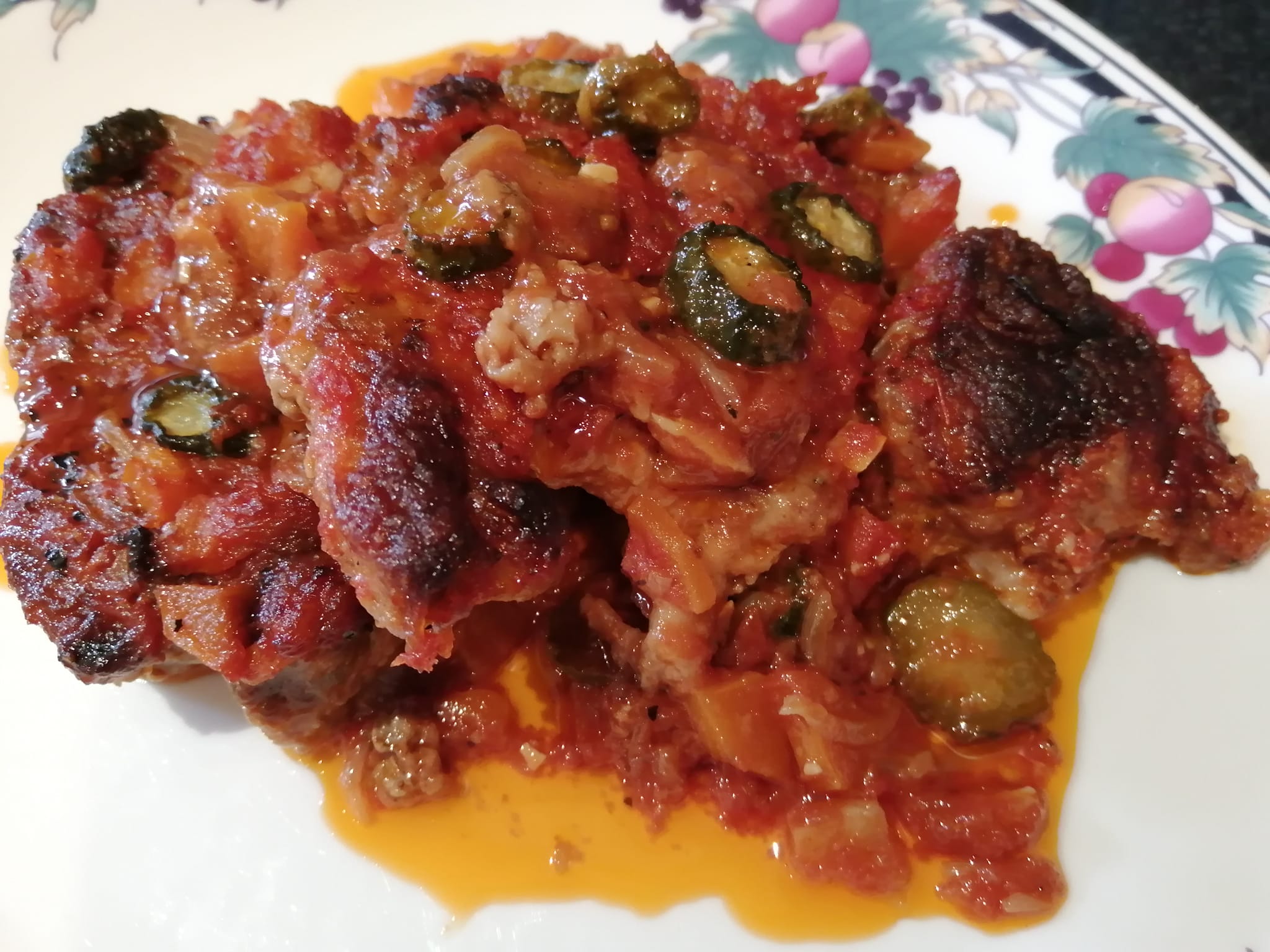 Στο λίπος από τις μπριζόλες τηγάνισα κρεμμύδι ψιλοκομμένο, καρότα ψιλοκομμένα, κεφάλι σκόρδο ψιλοκομμένο, πρόσθεσα τις ντομάτες, ανακάτεψα κανα δύο φορές και τις έριξα πάνω από τις μπριζόλες,