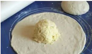 Παίρνουμε την φουσκωμένη ζύμη και τη χωρίζουμε σε δύο ίσα μέρη. Από το ένα μέρος ανοίγουμε μια κρούστα με διάμετρο που να χωραει μια μπάλα κίτρινο τυρί.