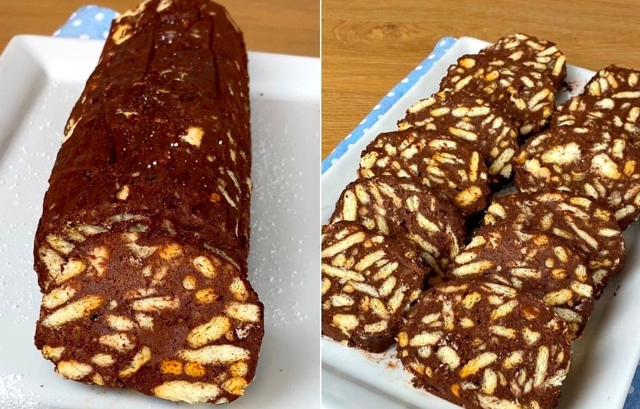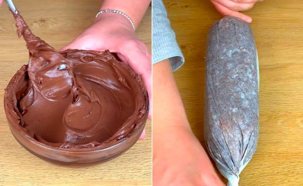 3 Βάλτε το μείγμα πάνω σε χαρτί ψησίματος καντε το ρολό με τα χέρια και μετα τηλιξτετο σαν σαλάμι.